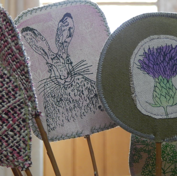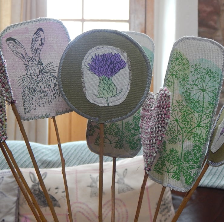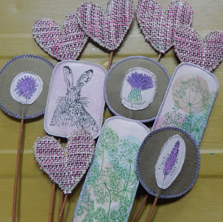 There is one hare that is screen printed onto a simple lino print. There are 2 cow parsley panels that have been screen printed then each has a round lino print on top. There is 1 scabious, 1 thistle and 1 plantain screen printed and then hand painted in mauve, this has been appliqued to a green denim circle. There are 5 pink hearts.