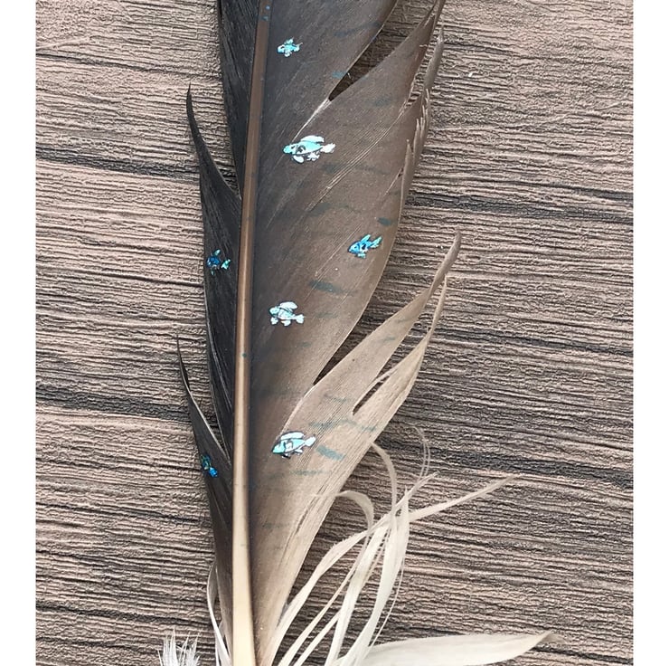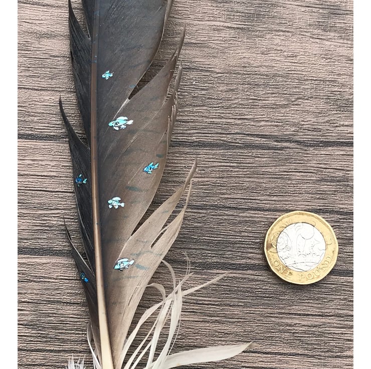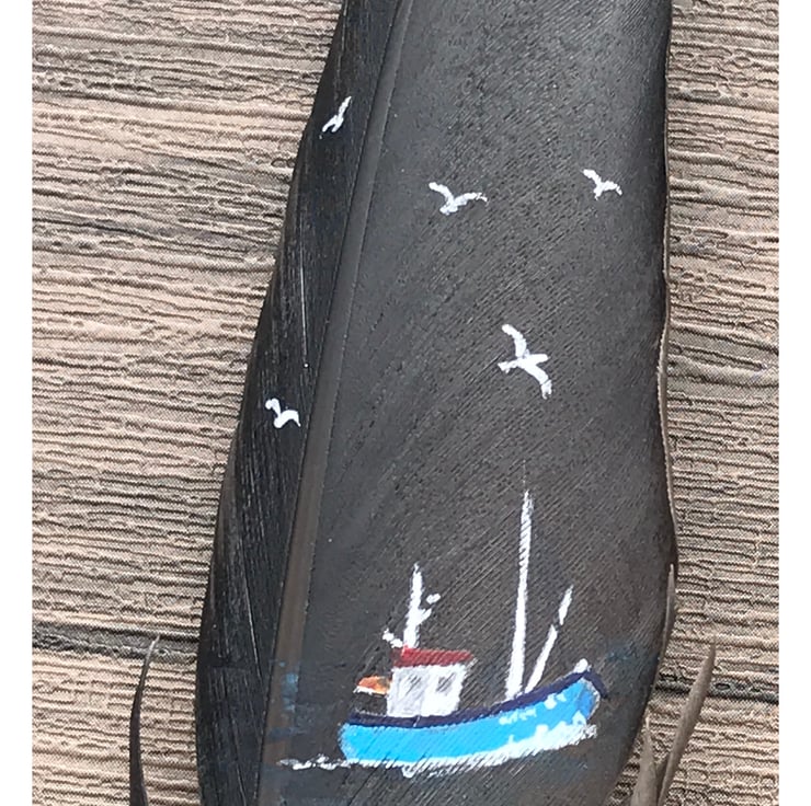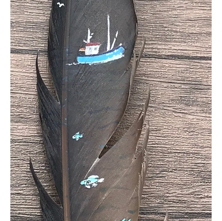 .A Seagull feather painted with an image of the three aspects of the sea - gulls above, fish below, and the fishing boat between.