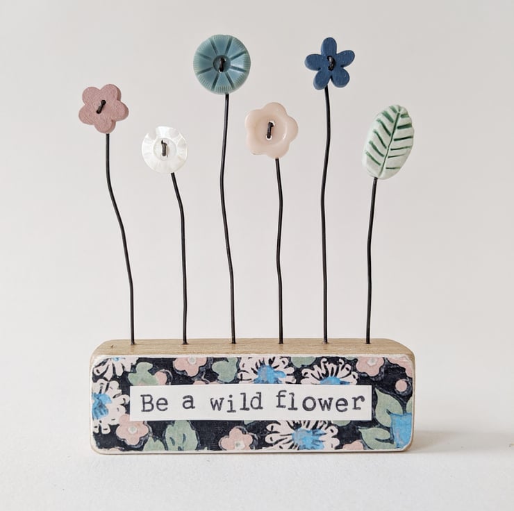 Button flowers grow in a row in this little garden with a clay leaf. They stand on their wire stalks in an oak wood block with a decoupaged floral front.