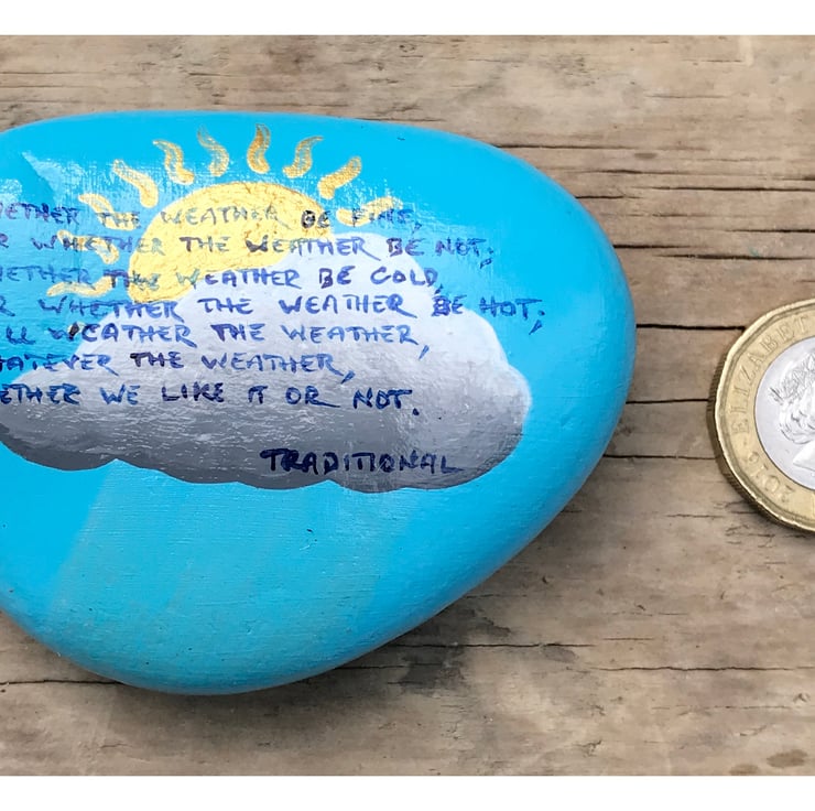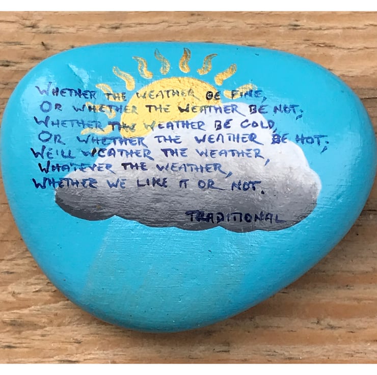 A short poem, particularly appropriate for the British weather and temperament, painted over a stylised image of sun, cloud and rain on a beach pebble.