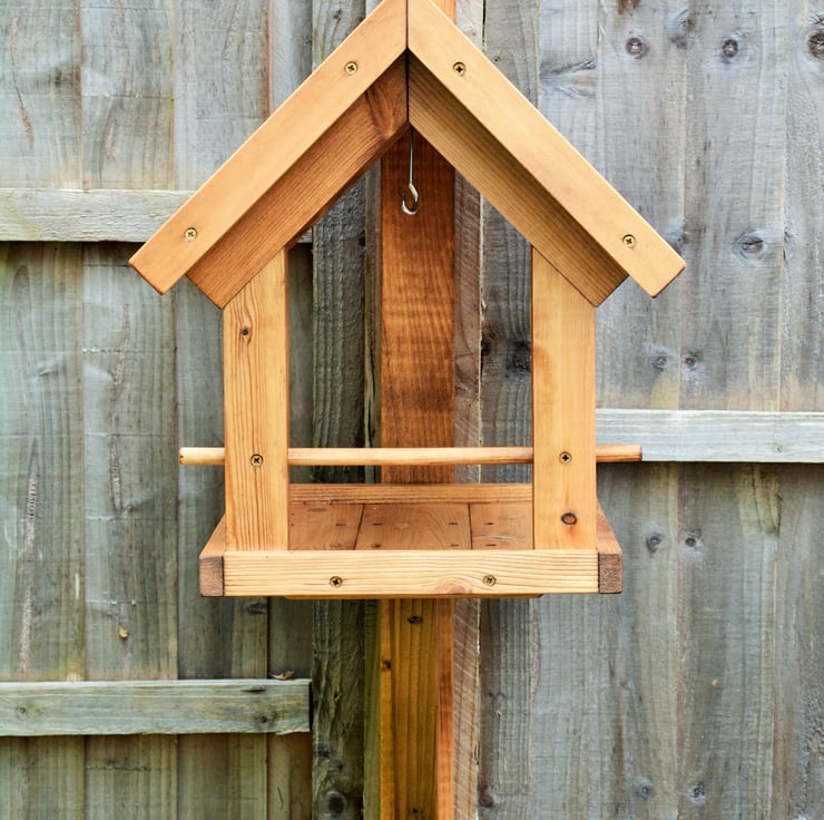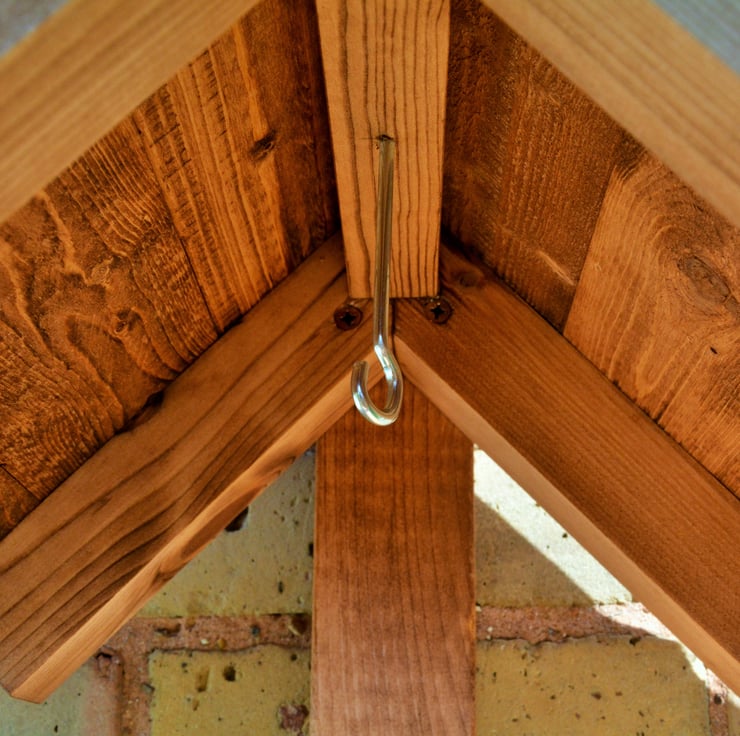 The roof is constructed using a planed timber and finished off with fascia trim at the front and rear. There are two pre-drilled counter sunk holes on the rear support to enable easy fixing and the tray has a pre-drilled drainage hole in each corner. A sturdy hook is fitted to allow the hanging of fat/seed balls etc.