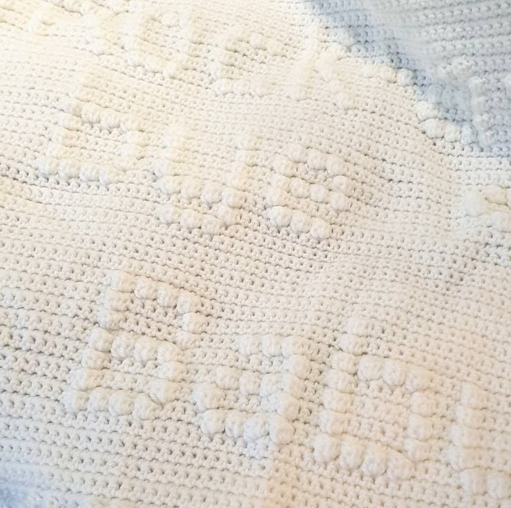 This listing is for a handmade baby blanket. It has been crocheted using the bobble or popcorn stitch and has the words "Rock a bye baby" on it along with some cute little hearts! It is bright white and is crocheted in aran weight yarn. The blanket is lovely and soft and has a nice drape.