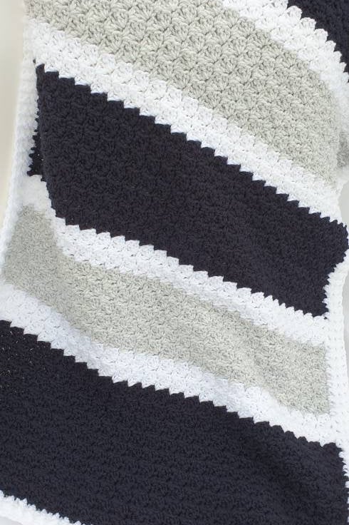 This listing is for a handmade blue, grey and white baby blanket. It has been crocheted using aran weight yarn and it's lovely and soft and has a nice drape. The pattern used gives the blanket a great texture and the stripe is a really modern look.