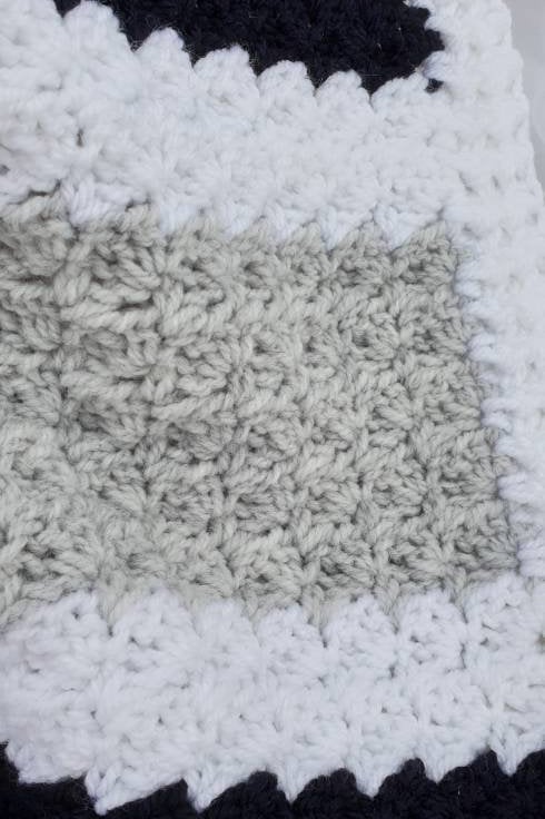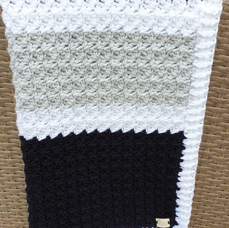 This listing is for a handmade blue, grey and white baby blanket. It has been crocheted using aran weight yarn and it's lovely and soft and has a nice drape. The pattern used gives the blanket a great texture and the stripe is a really modern look.