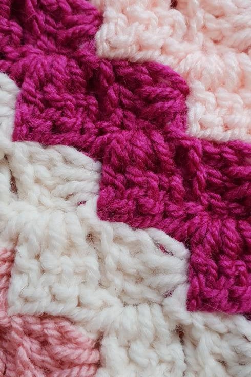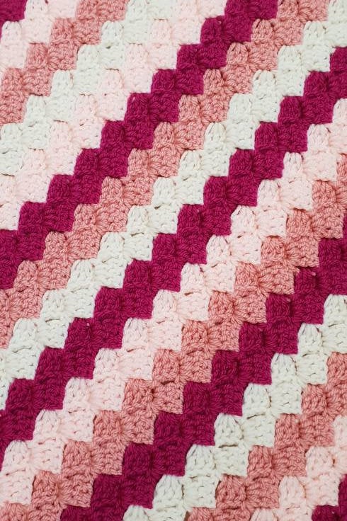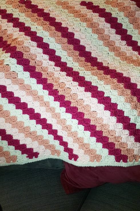 This listing is for a handmade baby blanket. It has been crocheted using pinks and cream Aran weight yarn and it is lovely and soft.
