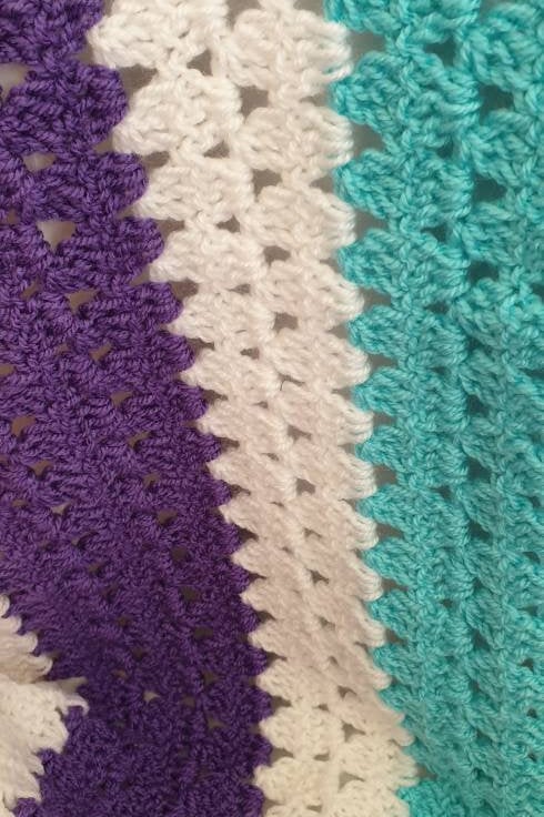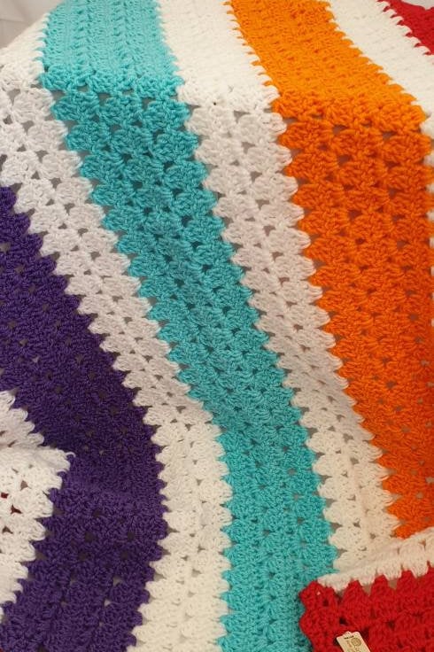 This listing is for a handmade red, purple, turquoise, orange and white baby blanket. It has been crocheted using double knit yarn using the traditional granny square stitch in a striped pattern. It's lovely and soft and has a nice drape and it's very bright.