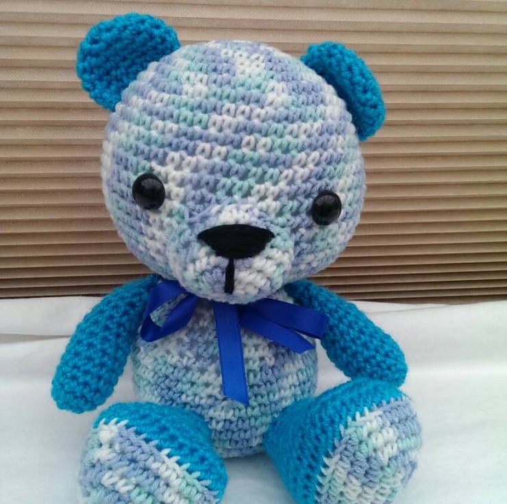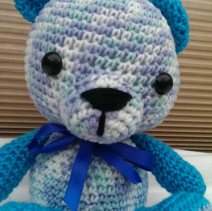 This cute Amigurumi Teddy bear has been crocheted using a blue and green mixed yarn and his arms, legs and ears are crocheted in a turquoise yarn. He has a blue ribbon around his neck for extra cuteness!.
