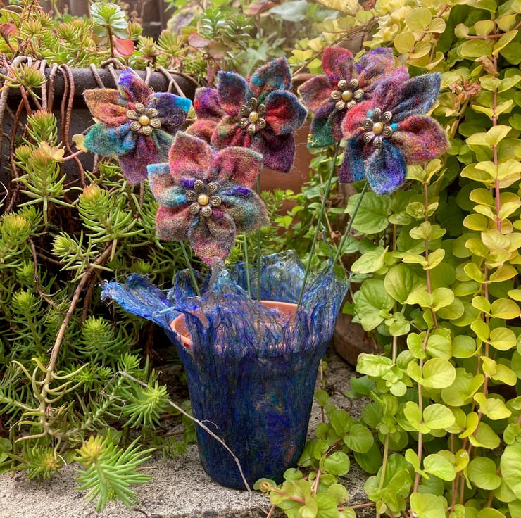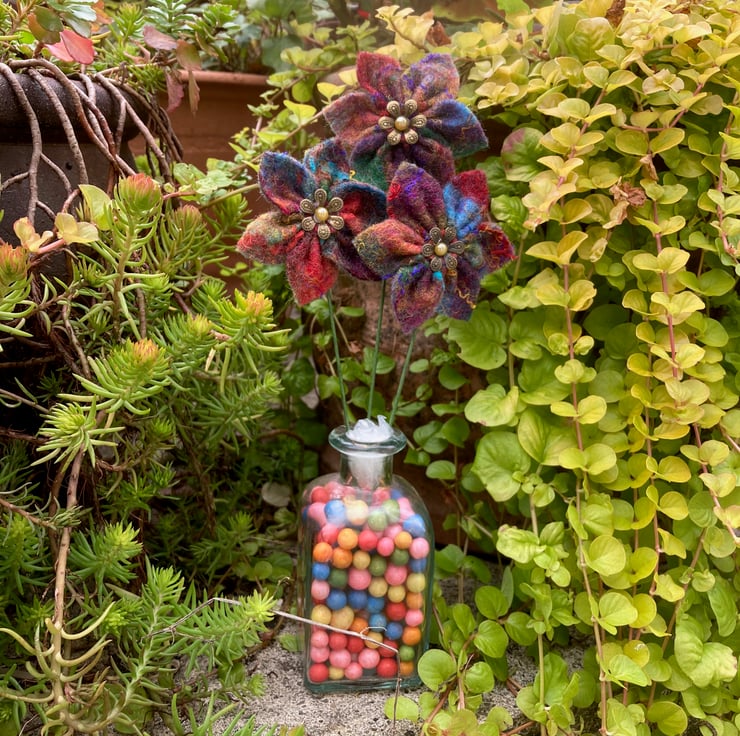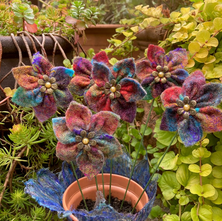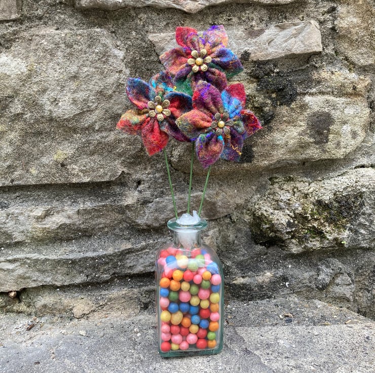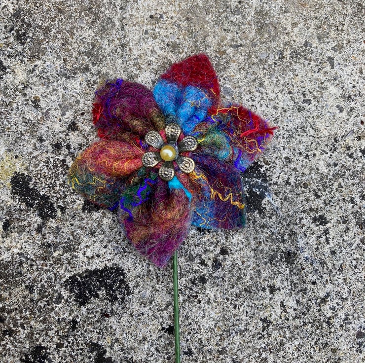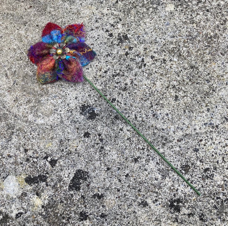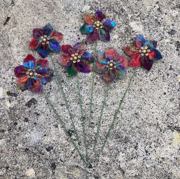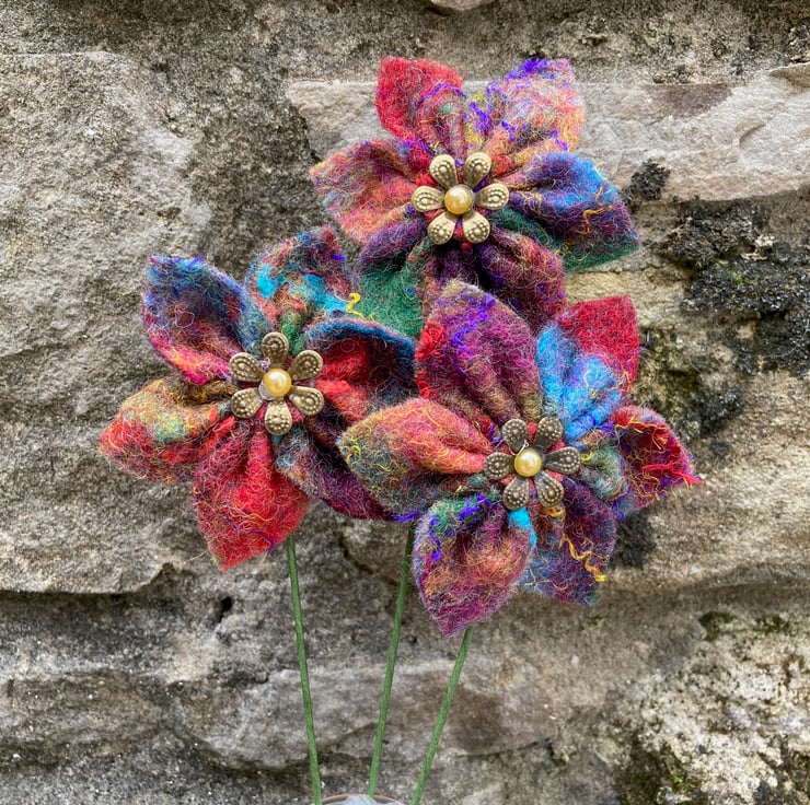 These flowers have been made using hand made felt sheets using lots of brightly coloured woollen fibres with various silk fibres added to the surface. The felt has been cut and stitched into a flower shape and a stiff green wire stem attached. A small brass coloured petal bead with a golden yellow pearl centre has been added to the centre of each flower. The flowers measure approximately 6cm (2.4") in diameter and the wire stem is approximately 16cm (6.3") long but can easily be cut and bent as required.