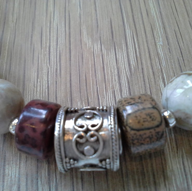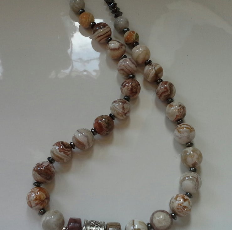 A very stunning statement necklace designed and hand crafted in Cornwall for either sex. The necklace has 312cts of faceted highly polished African jasper which has beautiful natural markings within them. To compliment them faceted 29.33 cts of Heamatite gemstones have been used. In the centre of the necklace is a large heavy weight decorative sterling silver drum shaped bead. Either side are large jasper rondelle cut gemstones with sterling silver beads either side.