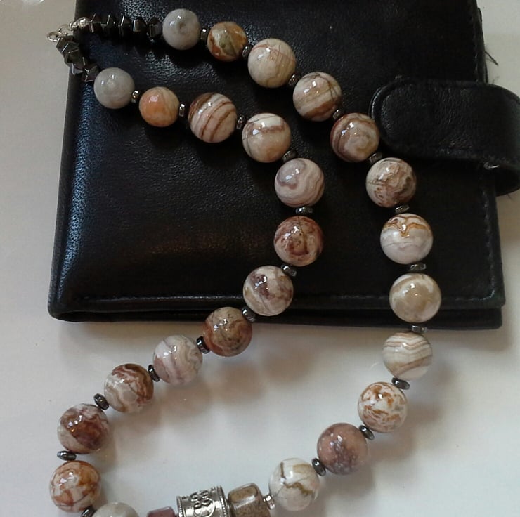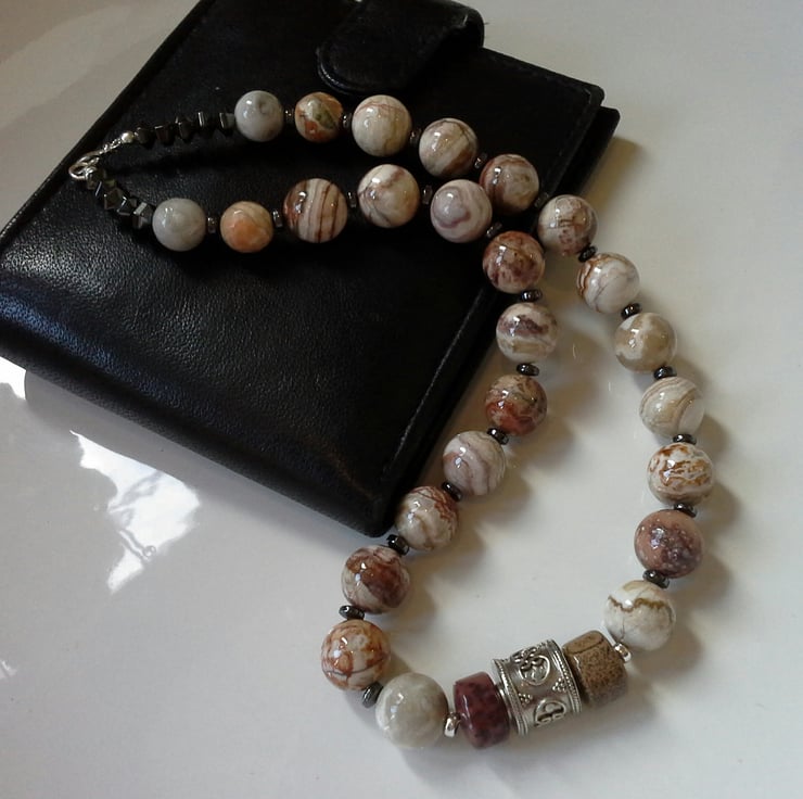 A very stunning statement necklace designed and hand crafted in Cornwall for either sex. The necklace has 312cts of faceted highly polished African jasper which has beautiful natural markings within them. To compliment them faceted 29.33 cts of Heamatite gemstones have been used. In the centre of the necklace is a large heavy weight decorative sterling silver drum shaped bead. Either side are large jasper rondelle cut gemstones with sterling silver beads either side.