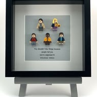 Mary Poppins custom mini figure picture. This picture includes a mini figure of Mary Poppins complete with Umbrella with the caption "There's a whole world at your feet- Mary Poppins", mounted on a silver grey backing card in a black box frame which can be wall mounted or free standing. Overall frame measures 25 by 25 cm.