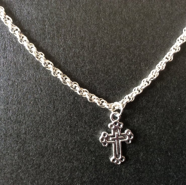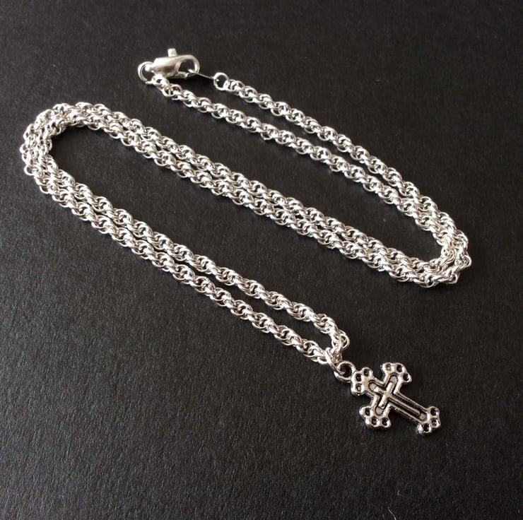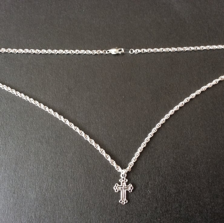 Delightfully simple and elegant, cross charm necklace. A 2cm Tibetan Silver charm, on a bright silver plated rope chain with an elegant lobster clasp.