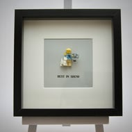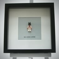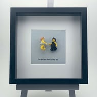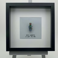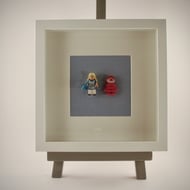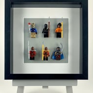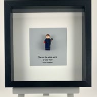 Stranger Things mini figure frame. This picture includes Mike, Eleven, Will, Lucas and Dustin complete with the caption " You shouldn't like things because people tell you you're supposed to - Stranger Things"i mounted on a silver-grey backing card in a black box frame which can be wall mounted or free standing. Overall frame measures 25 by 25cm