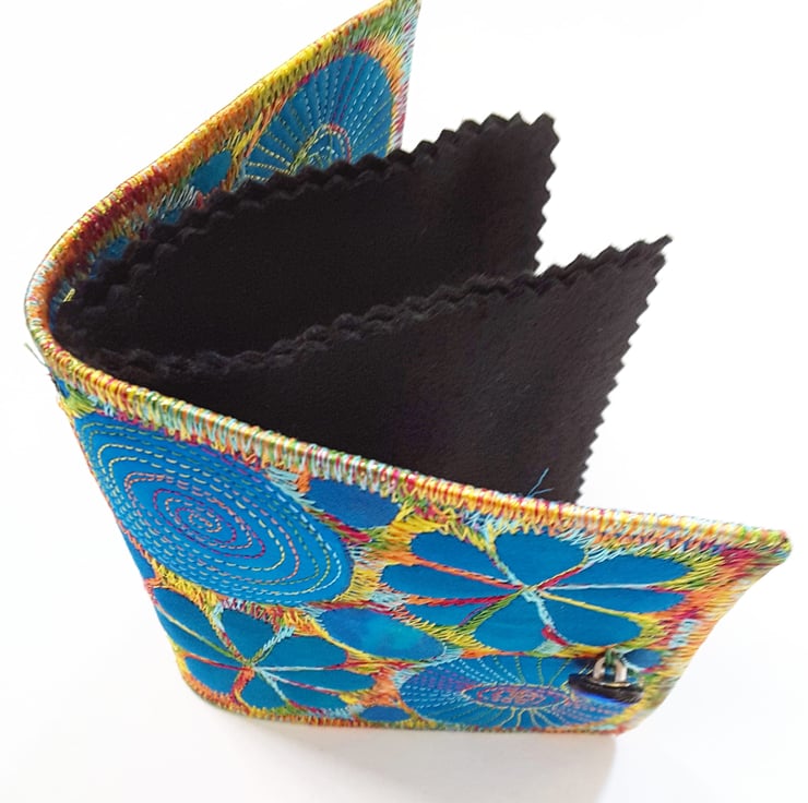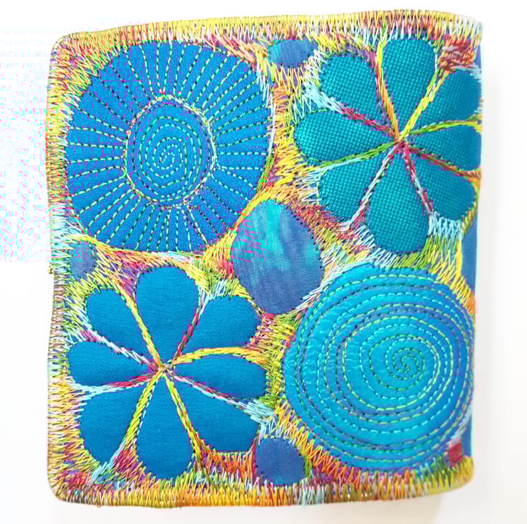 Made from layers of fabric including hand dyed Egyptian cotton and silk fabrics using the free machine embroidery style of sewing