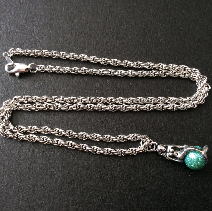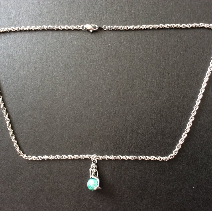Delightfully simple and elegant. A 2cm Tibetan Silver seated mermaid charm, on a bright silver plated rope chain with an elegant lobster clasp.