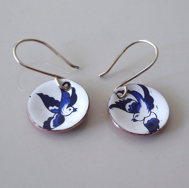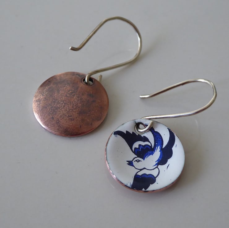 White enamelled copper earrings decorated with birds from the willow pattern, in dark blue. These earrings are slightly concave, with a natural copper finish on the back. They measure approximately 15mm in diameter and are suspended from sterling silver earring wires.