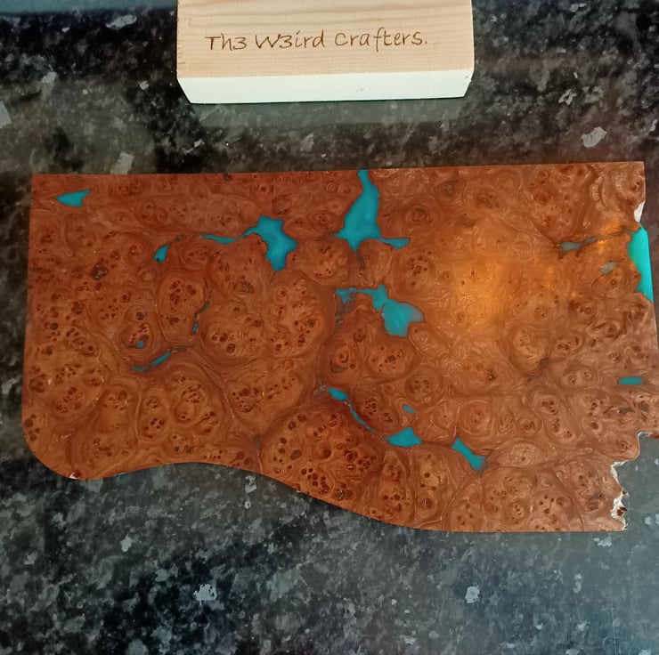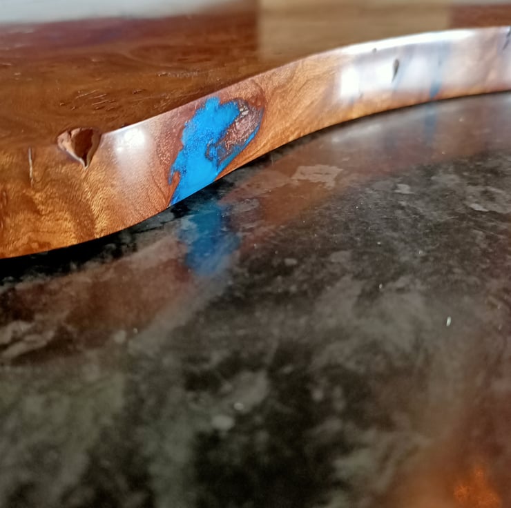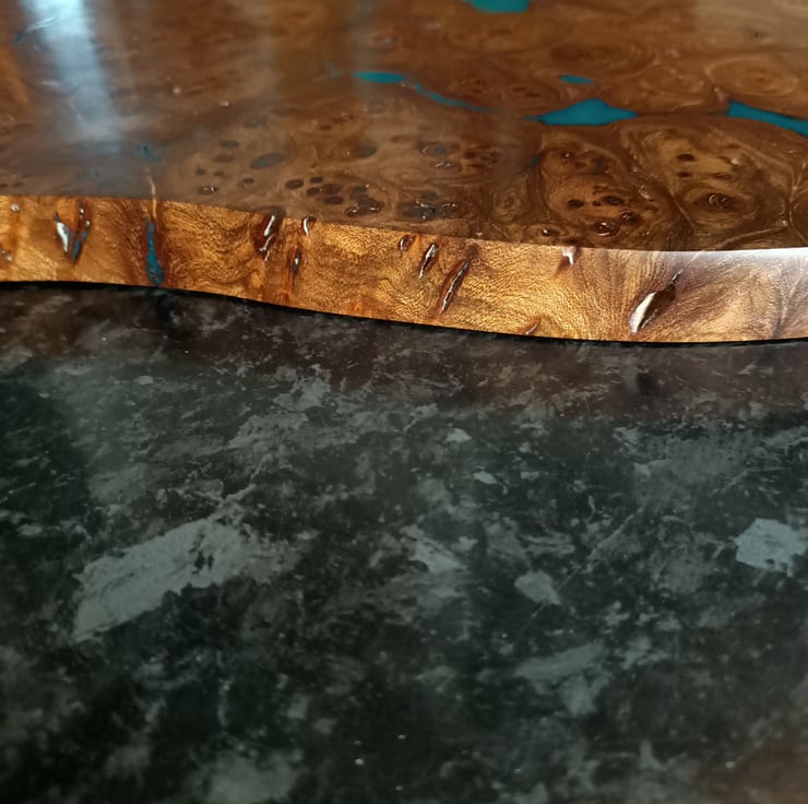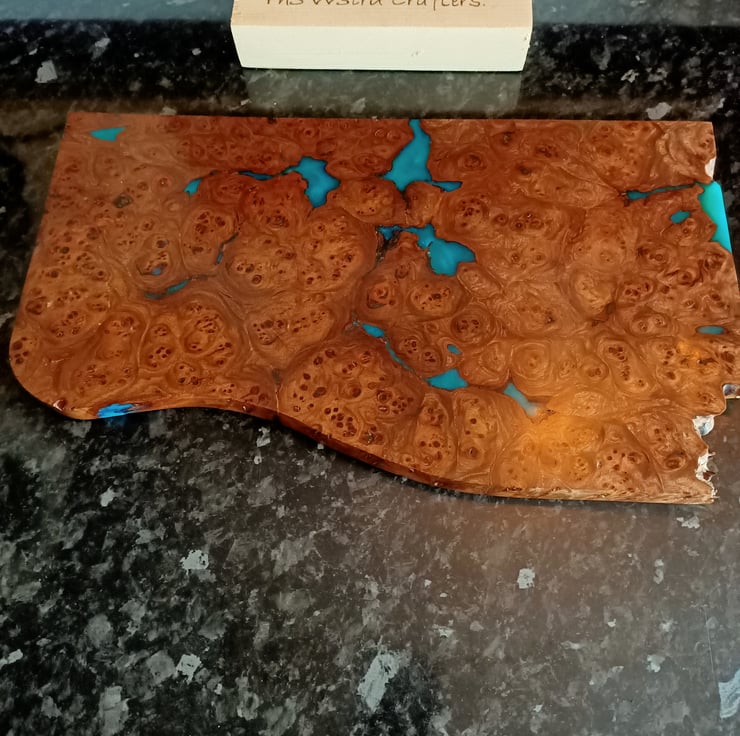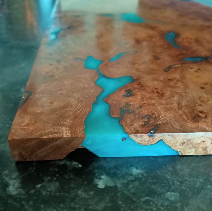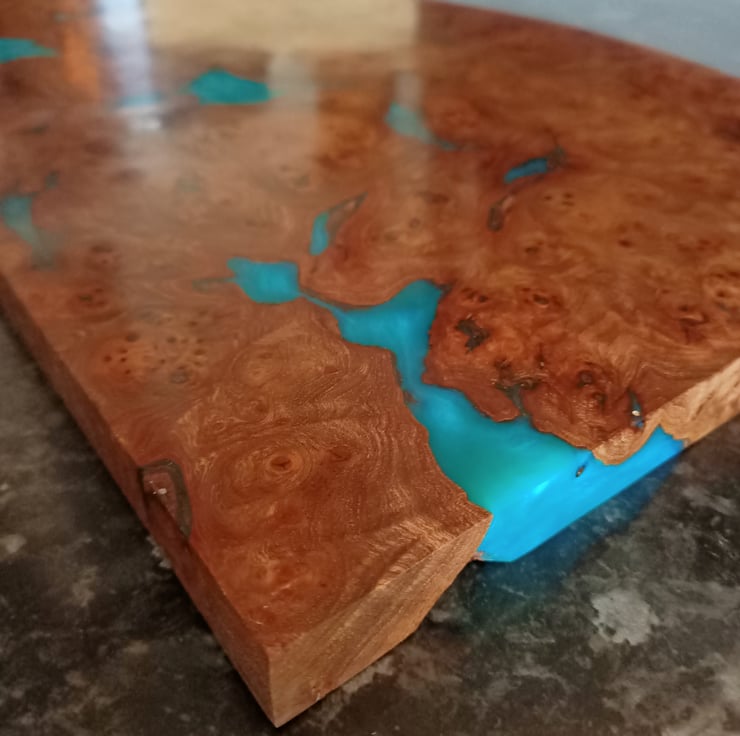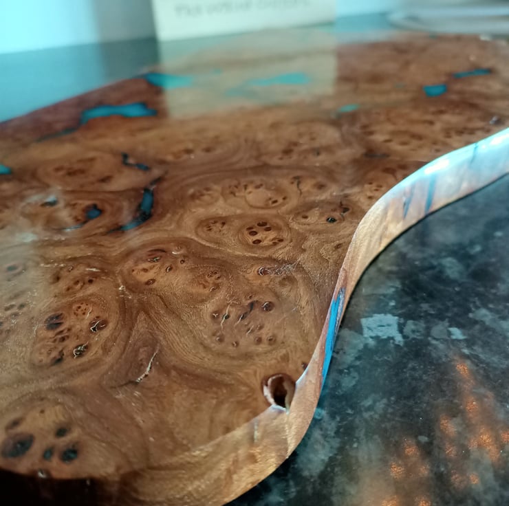 wood and resin unique chopping board. Scottish Elm Burr wood with teal resin. Stunning statement kitchenware handmade and designed by us, designed using stunning Scottish Elm wood and teal colored resin, hand cast using traditional methods. This unique chopping board has taken months of hand work. We sourced the burr wood, which is exceptional quality, tight swirls and remarkable grain. We have used a sweeping style designed onto the wood to create a flowing movement at one end, while keeping the stunning natural burr at the other end. All the loose burr has been removed by hand, and we have filled the bigger cracks with a teal colored resin, created especially for this board. This board has been worked by hand and is totally unique. This board has been hand sanded to a very high grit, oiled with food safe oil and waxed then re sanded giving a highly polished like marble finish. The overall effect is striking!