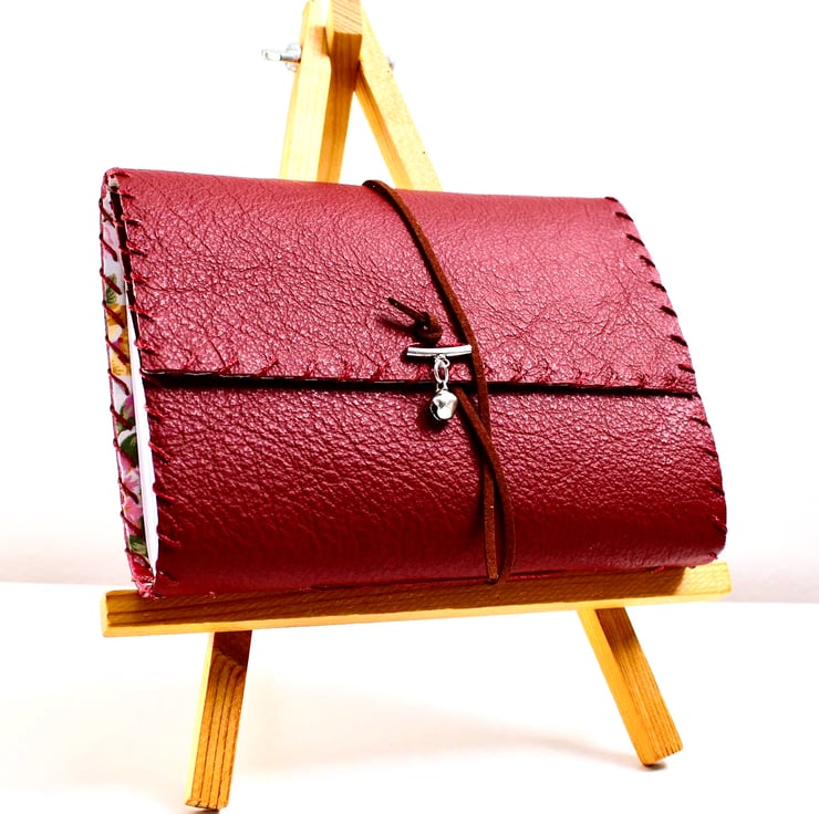 A beautiful red leather with a colourful floral material lining. The notebook is hand stitched around the edge and contains 200 blank sheets of paper which are then hand stitched to the leather in 5 signatures. The notebook is fastened with a leather cord tied loosely at the front and charm With a small bell added to complete the look.