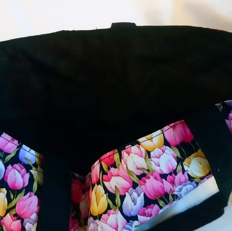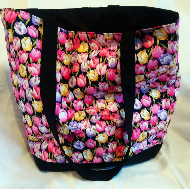 This tote bag has been made from a black fabric featuring tulips in pink, purple and yellow.
