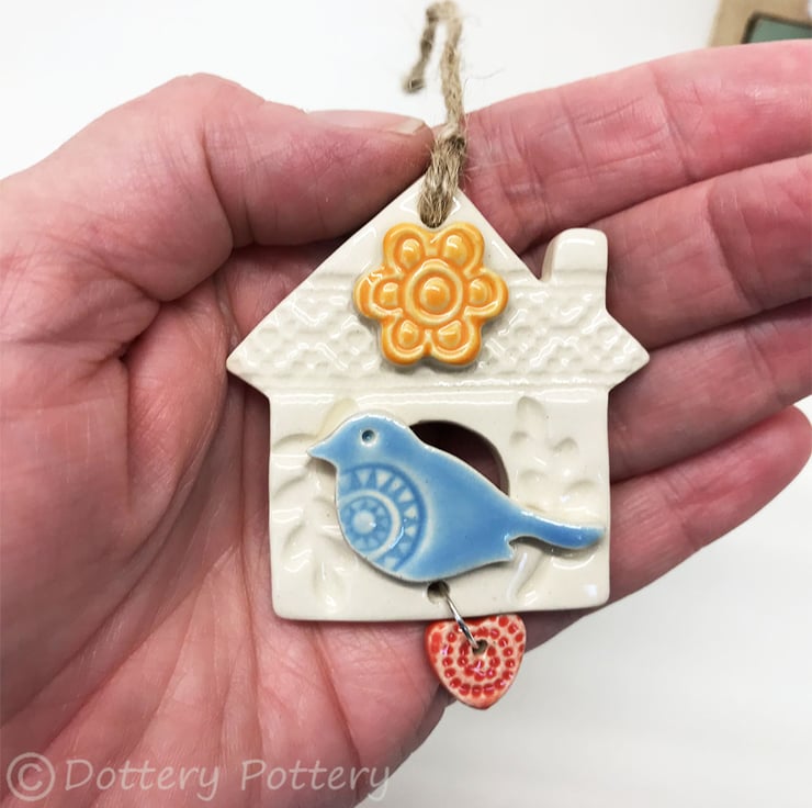 This little bird house decoration is made from white earthenware clay and finshed with a dangly heart and a bright bird. It has been fired twice and finished with a glossy glaze for a lovely smooth finish. It measures 7.5 x 7cm and hangs from rustic brown string