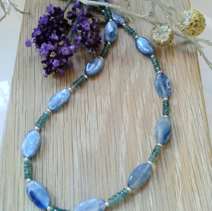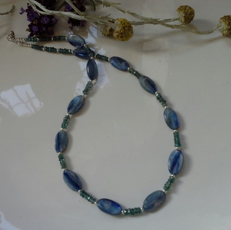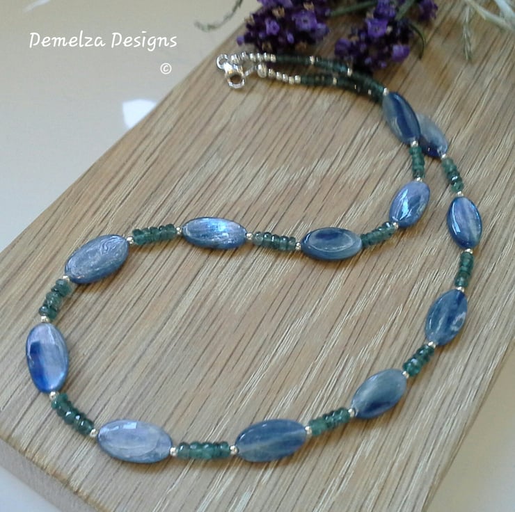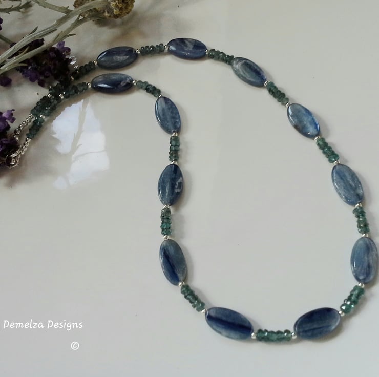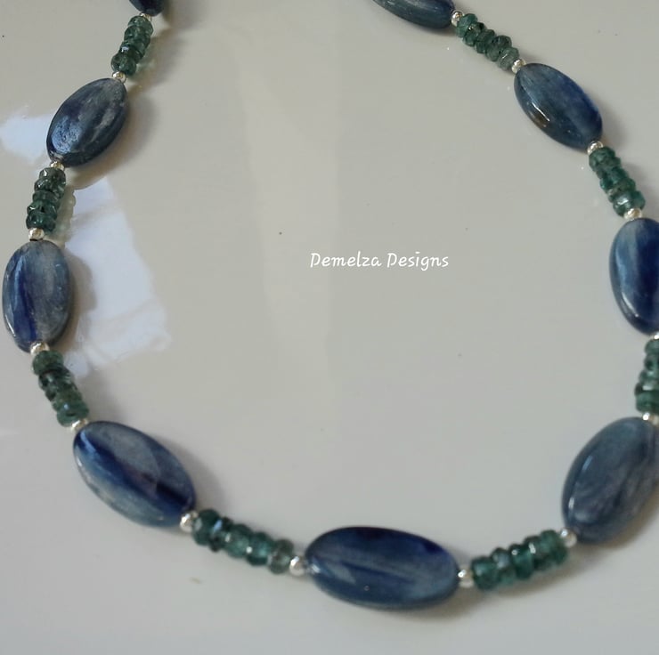 A beautiful necklace designed and hand crafted in Cornwall using extremely rare teal kyanite complimented with corn flower blue kyanite gemstones. The blue kyanite have exceptional internal sheiller as any light source hits each gemstone. The teal kyanite are faceted rondelle cuts with good clarity. Within the design are 2mm sterling silver spacer beads to add sparkle and an opulent finish.
