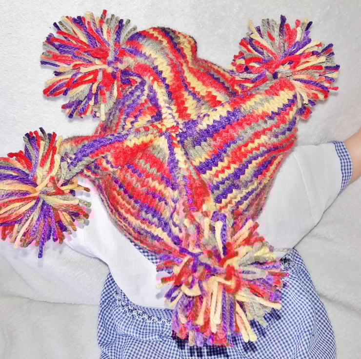 Jester style hat has 4 pompoms.