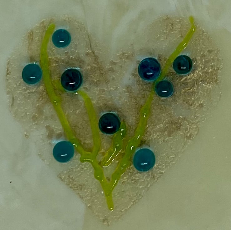 This marbled cream glass dish has a gold heart fused between the layers and has been decorated with twisted green stems and turquoise dots resembling ‘flowers’.