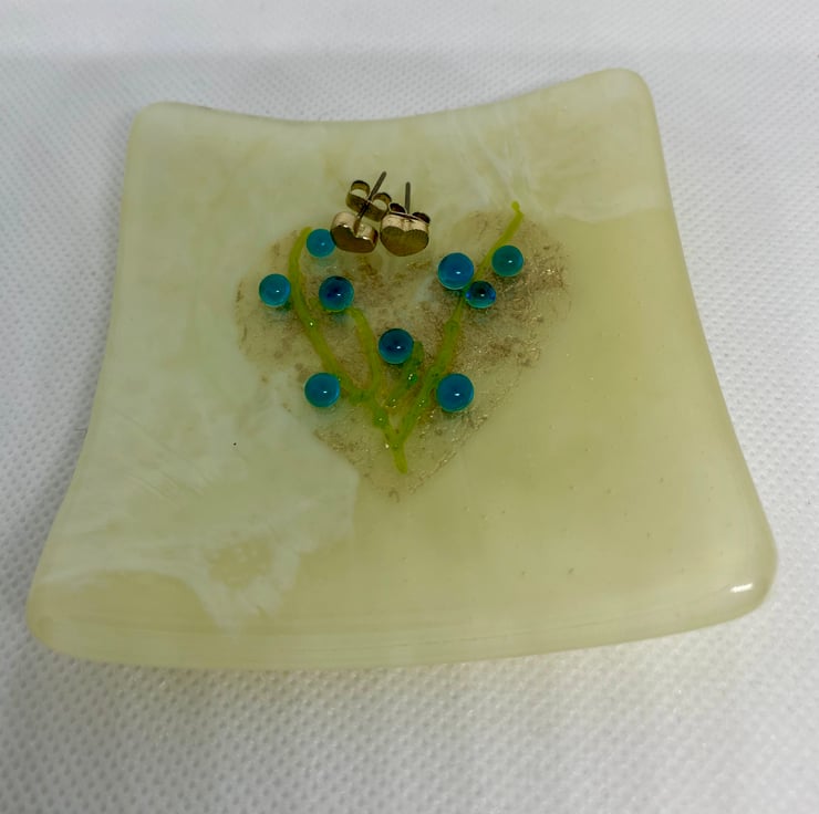 Initially a plain cream dish fused with a gold heart I thought it needed extra detail and I like the addition of the green and turquoise