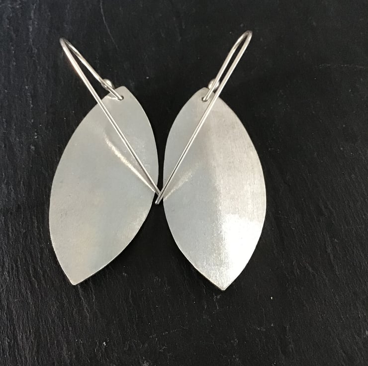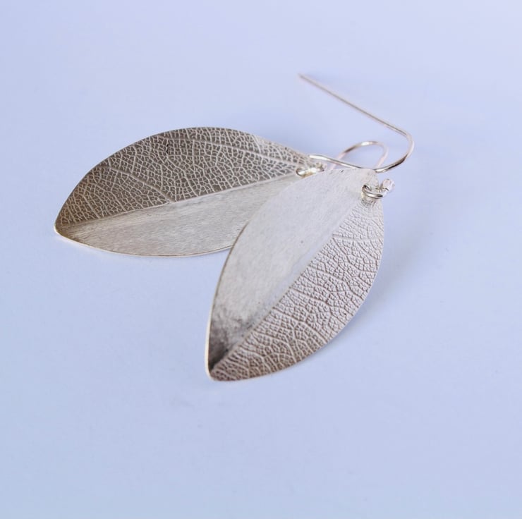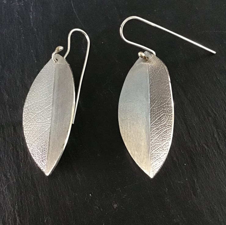 These gorgeous earrings are made by hand from Sterling Silver sheet, rolled with a 1/2 leaf pattern and 1/2 satin finish. They hang beautifully from handmade Sterling Silver ear wires.