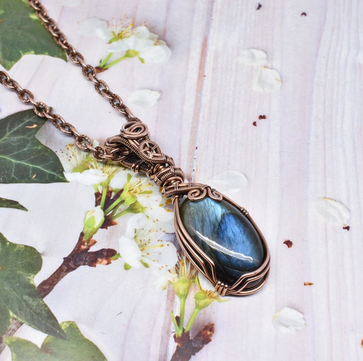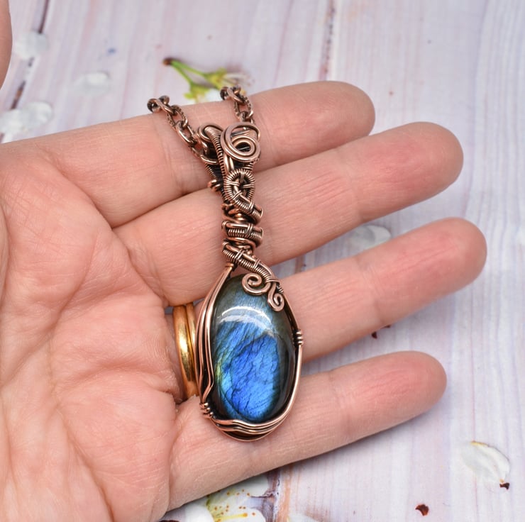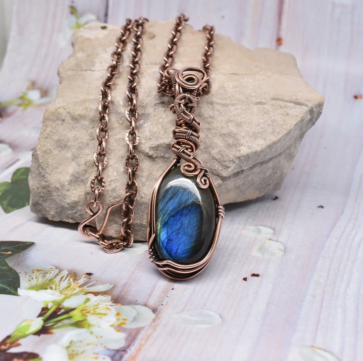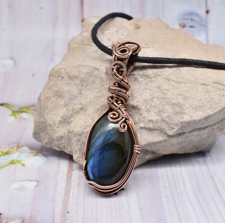 A beautiful blue labradorite I have wire wrapped and woven in solid copper wire to make this lovely unisex pendant.