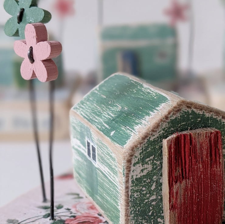 It sits on a decoupaged wooden base with two friendly flowers, and a heart made from polymer clay, shaped, fired and painted to finish.