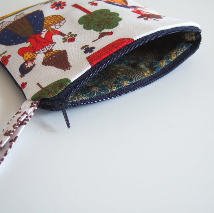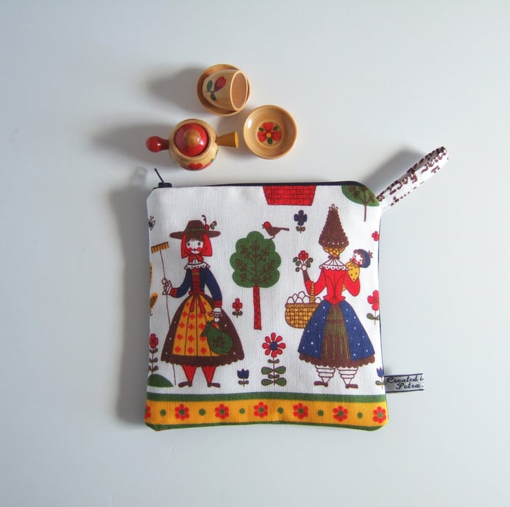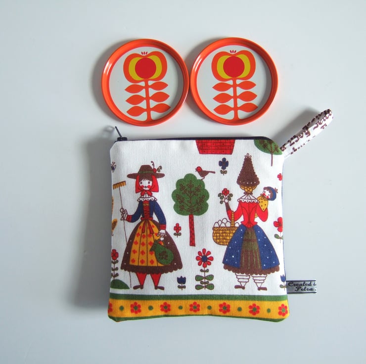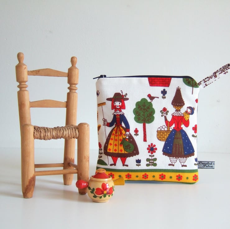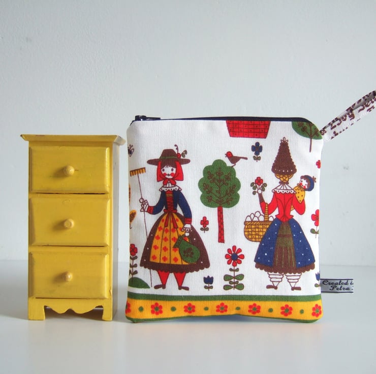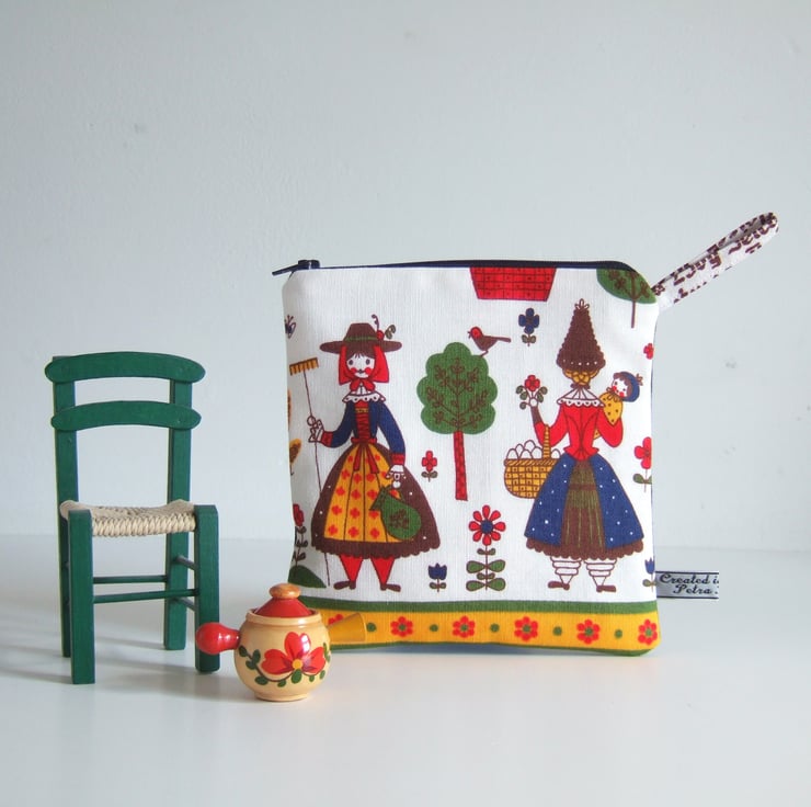 This make up bag, pouch or purse is made from a colourful vintage tea towel, all the way from Austria. It shows a happy Ruritanian scene of two women wearing bright Tyrolean regional costume, one with a rosy cheeked baby swaddled in her arms! This idyllic scene has a mid century feel to the design, and is scattered with birds and flowers. It would make a lovely gift for someone interested in costume or national dress, with mid century design, or perhaps for a new farmer!