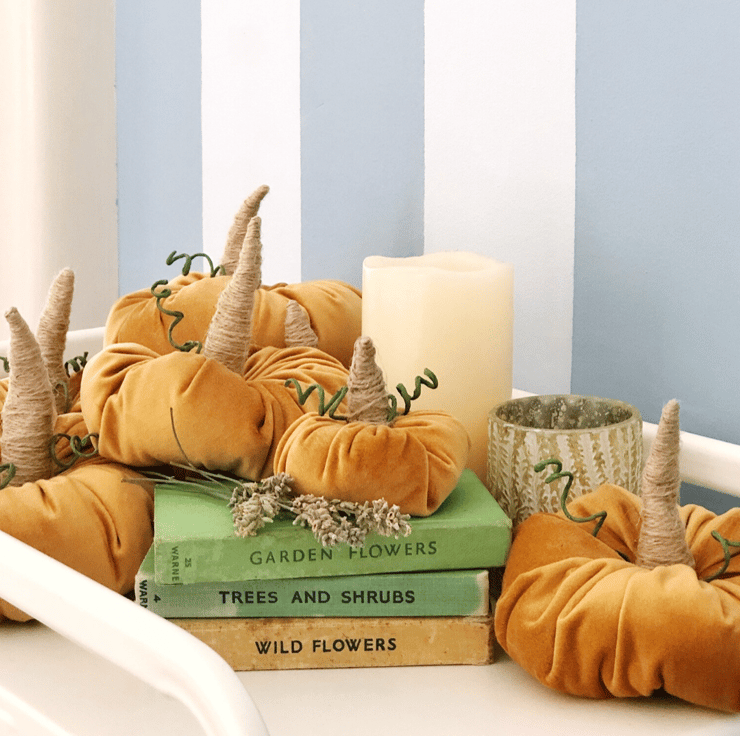 These lush fabric pumpkins are hand sewn using cotton thread in my humble craft room in Manchester. It is stuffed with polyfibre to give it volume. The branch is handmade from paper and twine glued to the top of the pumpkin. An extra touch of curly twine wrapped in green paper completes this velvety decor.