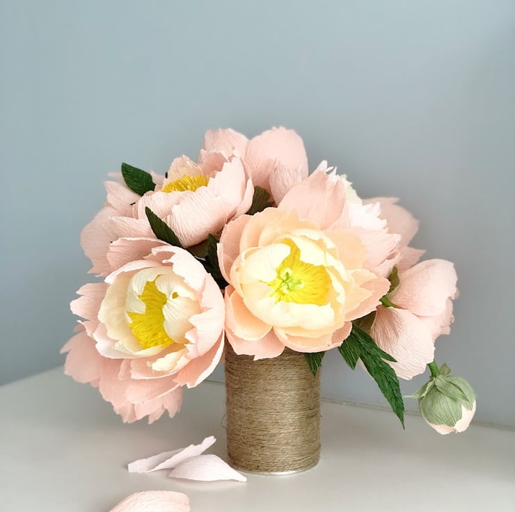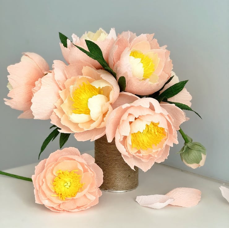 The bouquet is approximately 29cm tall and 28cm wide containing 8 full peonies and one bud.