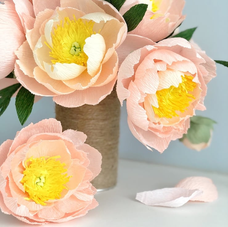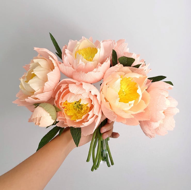 The flowers and leaves are made from premium Italian crepe paper which has brilliant colours and a texture that mimics nature. I hand cut the petals and leaves from this paper then shape them one by one to create unique dimensions. I put them together into flowers and leaf stems into metal wires and plastic tube covered in floral tape. After creating the individual blooms and foliage, I arrange them to form this bouquet and finally tied with a satin ribbon.