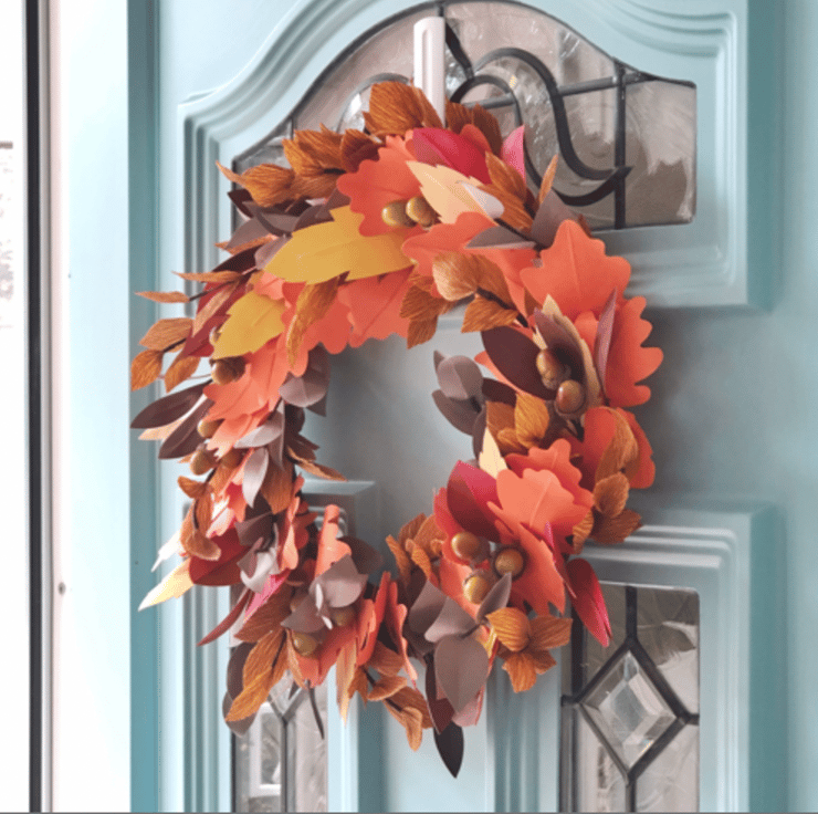 The leaves are made from a mix of 200gsm premium card stock and Italian crepe paper which has brilliant colours and textures that mimic nature. I hand cut the leaves from this paper then shape them one by one to create unique dimensions. I put them together into leaf stems into metal wires covered in floral tape. After creating the individual blooms and foliage, I arrange them on a base of willow wreath and secure in place with the help of hot glue sticks. As accents, I added decorative acorns to finish off the wreath.