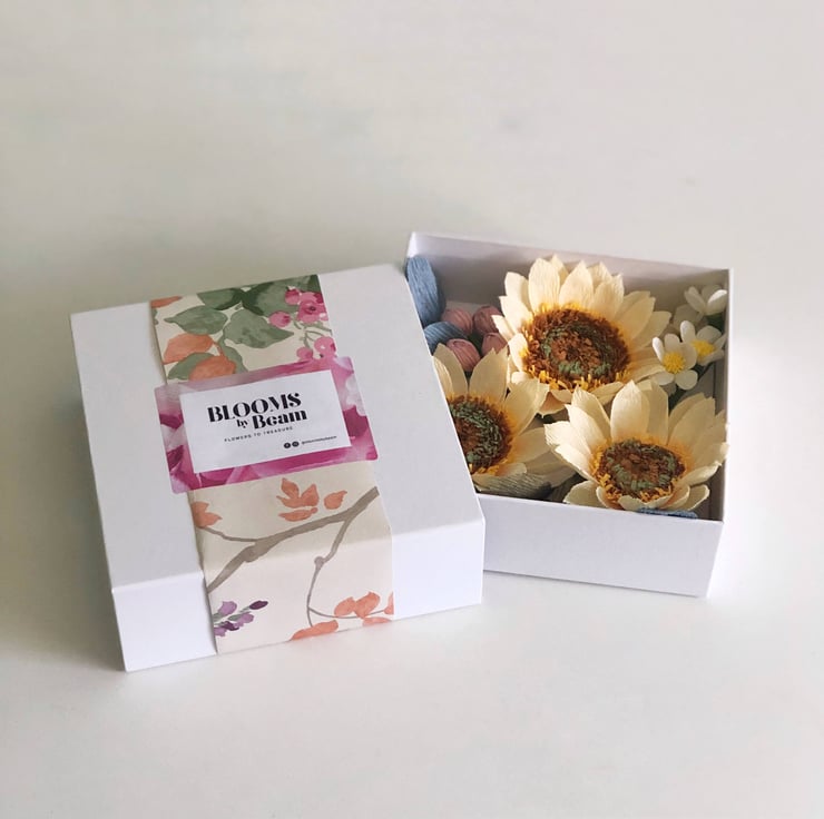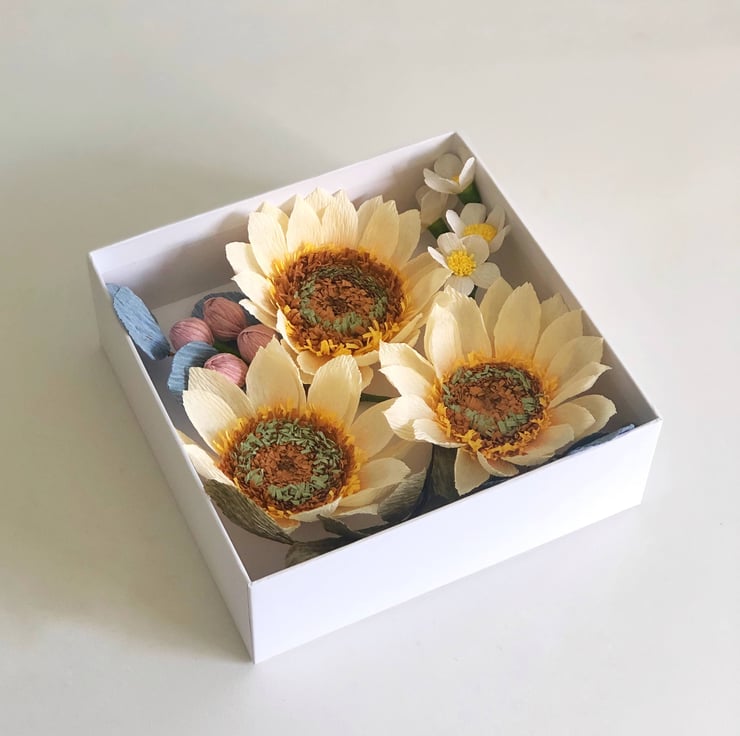 This small bouquet has sunflowers, daisies, berries and eucalyptus arranged and secured in place inside a box. It is packaged in an elegant matchbox-style container which makes it a truly impressive gift for anniversaries or birthdays. Its autumn colours make it the perfect bridesmaid proposal gift for a seasonal wedding that your best friends can treasure forever.