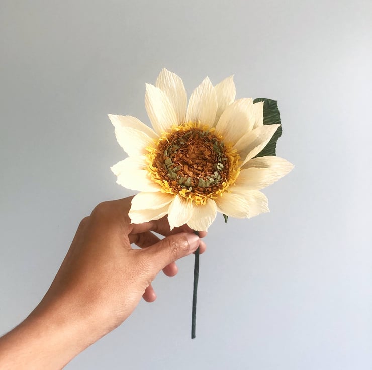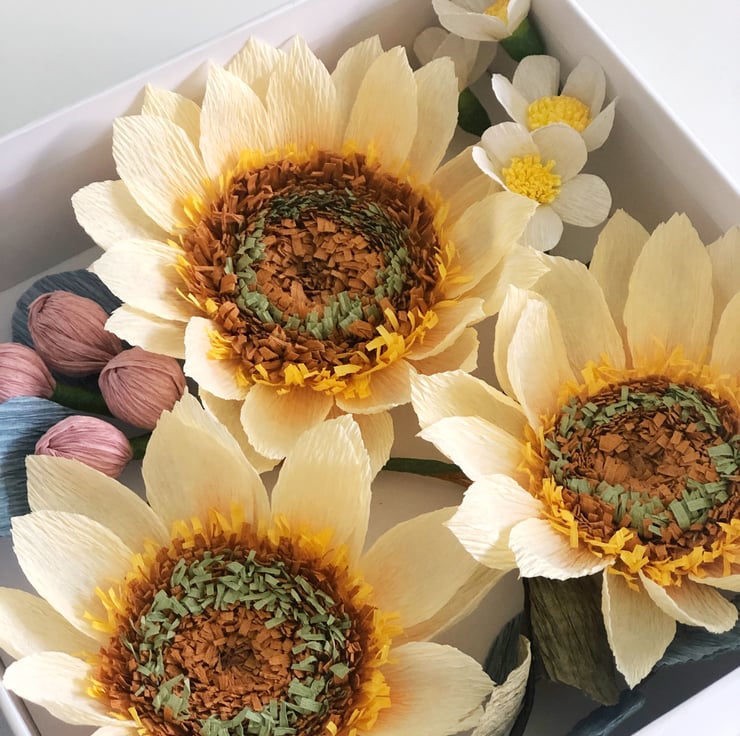 The flowers and leaves are made from premium Italian crepe paper which has brilliant colours and a texture that mimics nature. I hand cut the petals and leaves from this paper then shape them one by one to create unique dimensions. I put them together into flowers and leaf stems into metal wires covered in floral tape. After creating the individual blooms and foliage, I arrange them to form this bouquet and finally tied with a satin ribbon.