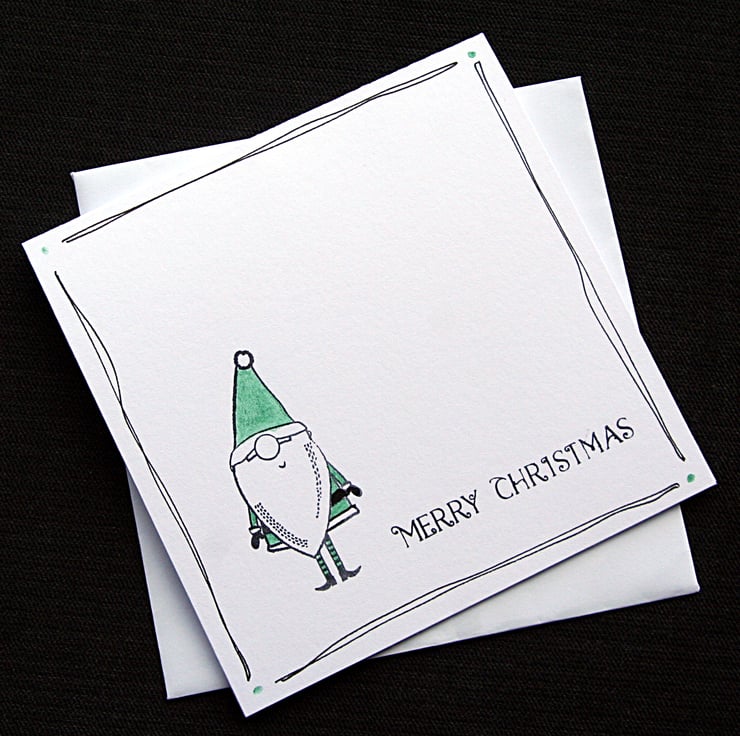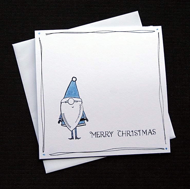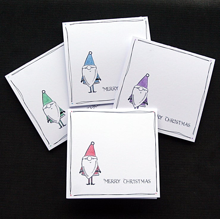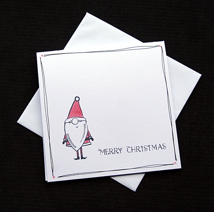 This set of 4 handcrafted cards each show a cute handstamped & hand coloured image of 'Santa'. The sentiment reads 'Merry Christmas' and is handstamped in black ink.