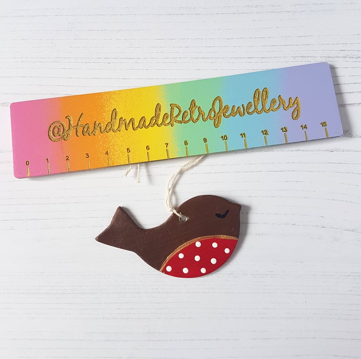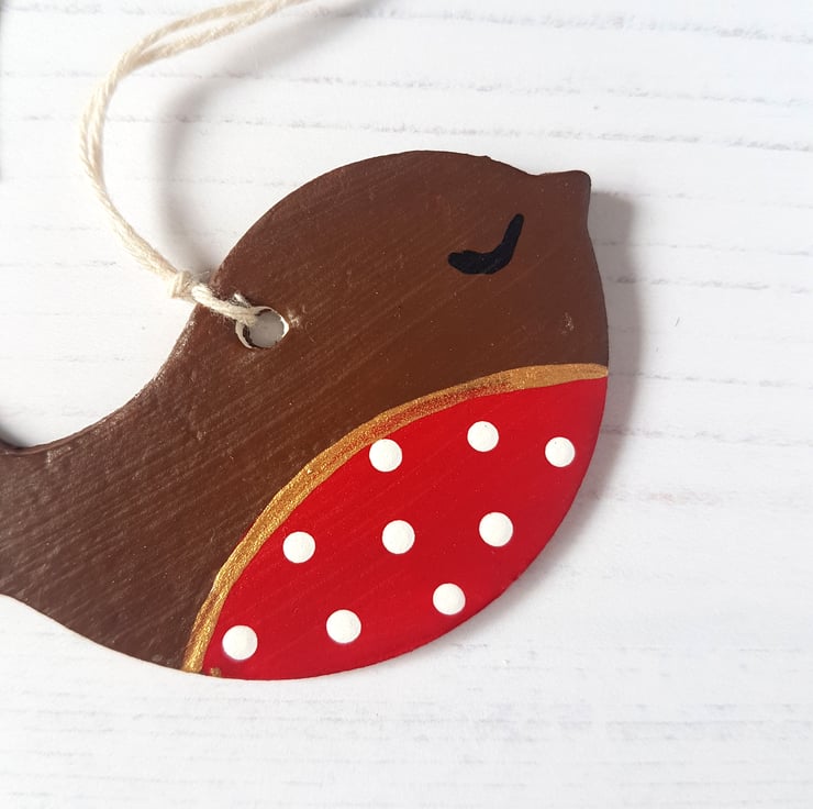 A gorgeous handmade robin shaped decoration, made using air dry clay, then hand painted using acrylic paints, with a white polka dot effect on his tummy! The robin is then sealed with a matt varnish, before having twine attached, ready to hang in your home or on your tree!