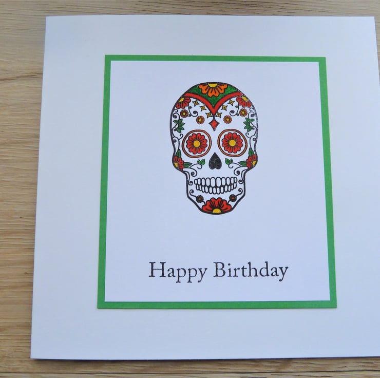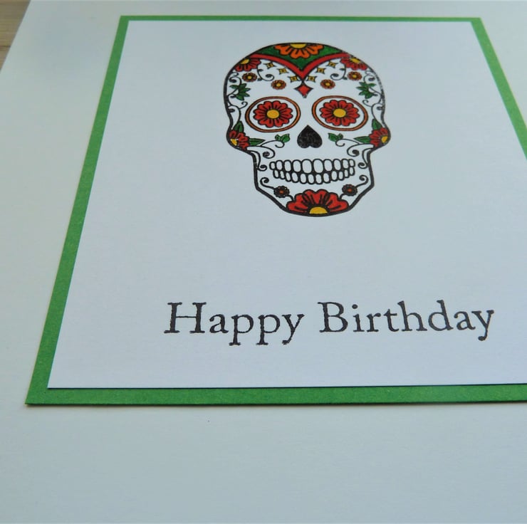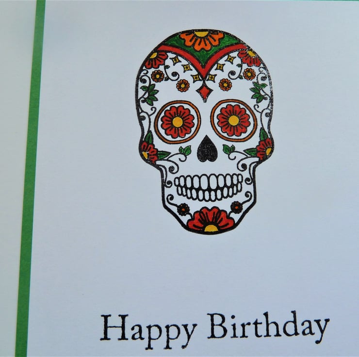 A card which features a hand stamped image of a sugar skull which has been hand coloured, the words 'Happy Birthday' have been hand stamped below.