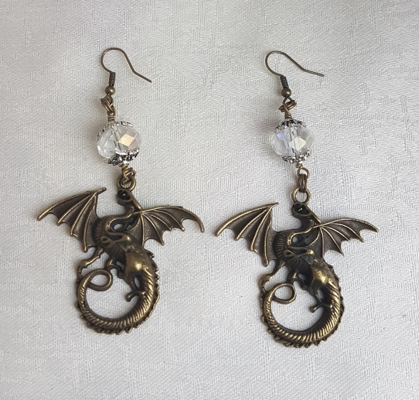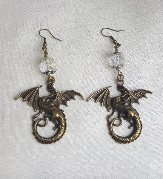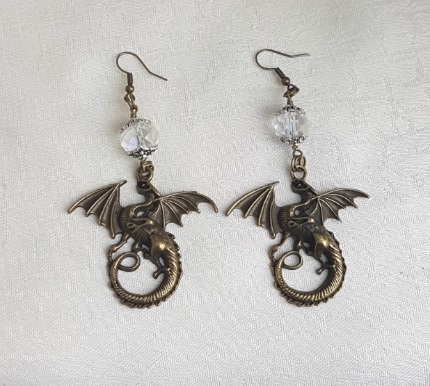 Please note this is NOT A TOY and should be kept away from babies, young children and pets as beads/charms can be dangerous if swallowed. If ingestion occurs seek medical treatment/advice. Dangly jewellery can get caught on clothing and in hair so please wear with sensibly with caution. Please do not clean with harsh chemicals like Antibacterial hand wash/hand gels these are strong alcohols and will tarnish metal, bleach beads and ruin your handmade jewellery. Perfumes/cosmetics etc can tarnish metals so please avoid contact with your handmade jewellery. If you need to clean your jewellery use a soft, damp cloth and carefully wipe clean. Dry thoroughly with a soft, non-abrasive cloth to avoid tarnishing. Do NOT soak or wet the earrings. The ear wires are hypoallergenic and nickel and cadmium free. If you have sensitive ears please wear with caution and remove if irritation occurs. If you are sensitive, and can wear them, please choose the Sterling Silver option. Obviously Sterling Silver will be a different colour to the rest of the earring. Environmental moisture, oxygen, body moisture can tarnish metals. It is recommended to wipe ear wires/earrings after use with a soft, dry cloth and store in the plastic bag provided to slow down/reduce the tarnishing affects. Materials. Antique Bronze tone Ear wires. Antique Bronze tone large Dragon Charms. Antique Bronze tone jump rings. Antique Bronze eye pins. Tibetan Antique Silver bead caps. Crystal Beads clear/AB