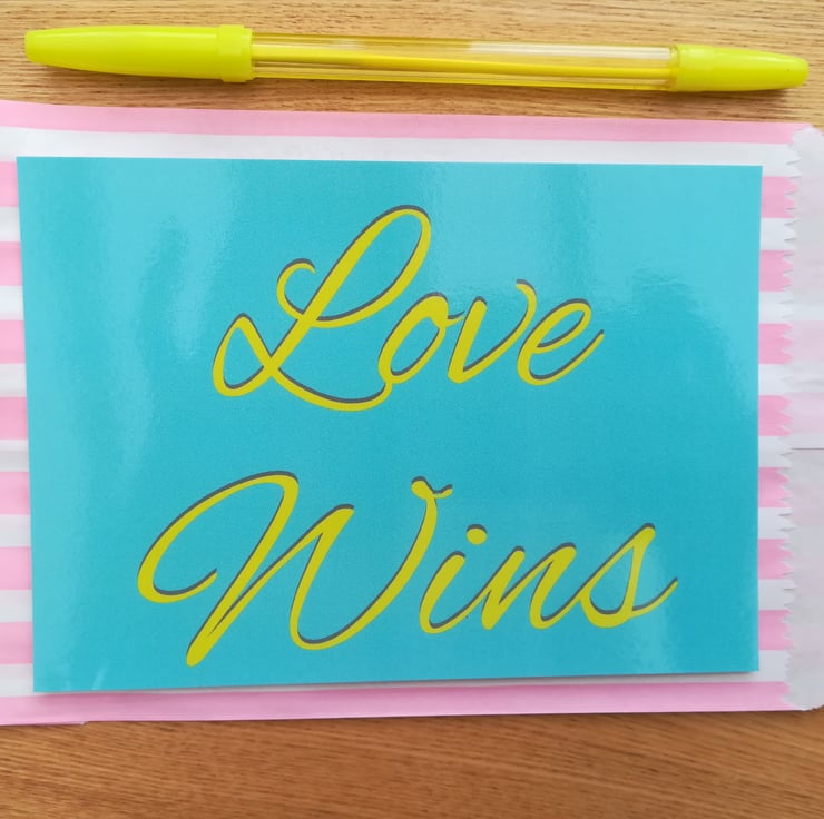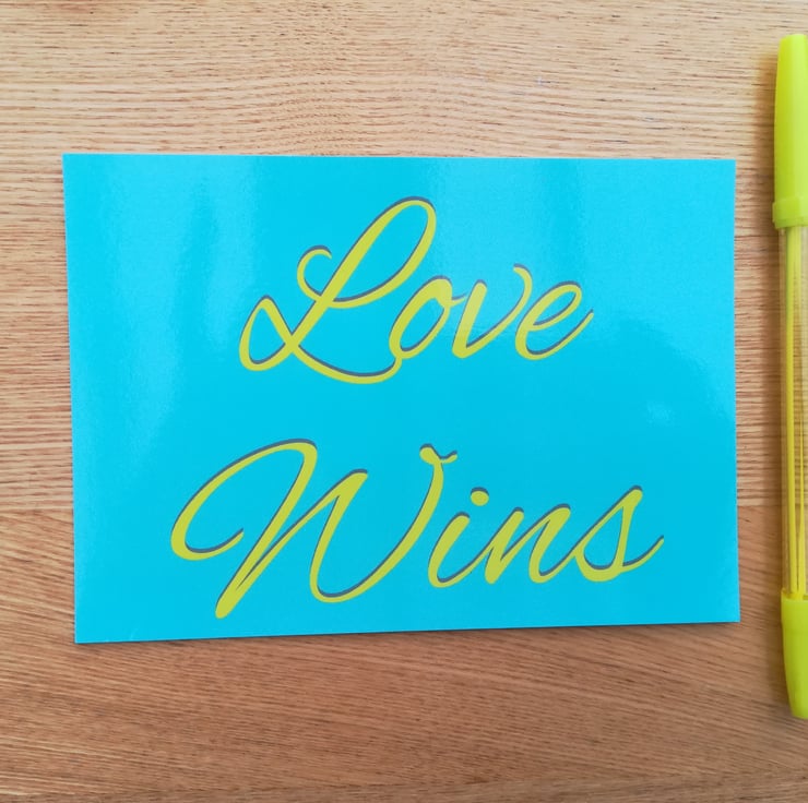 Love wins. Enough said! Celebrate pride in style - put this on a wall or in a window, or send it to a loved one in the post (just put a stamp and address on the back and pop it in the mail). Alternatively, include it with a card or gift.