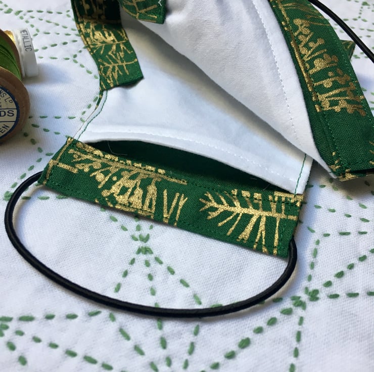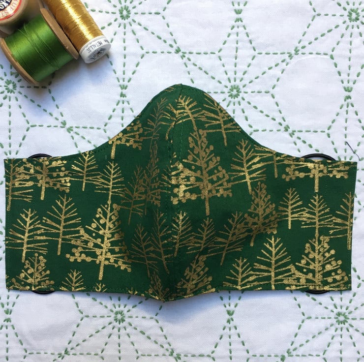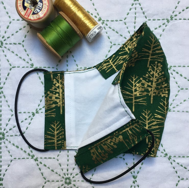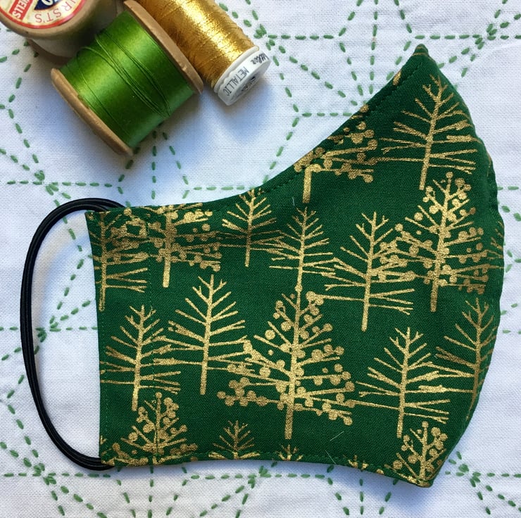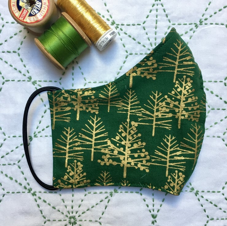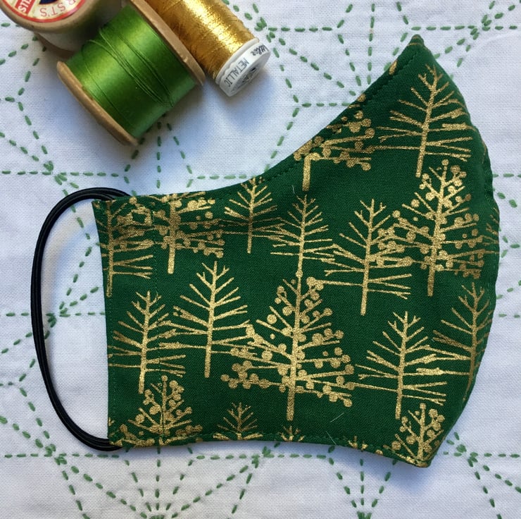 This Christmas fabric depicts gold metallic trees on a pine green cotton fabric. Some of the trees are sparse, some have leaves. The mask has been finished with green thread and the pattern creates a stylish festive mask. The fabric is high quality cotton and the mask is lined with a 600 thread count cotton, which is extremely soft against the skin. The mask is washable and reusable.