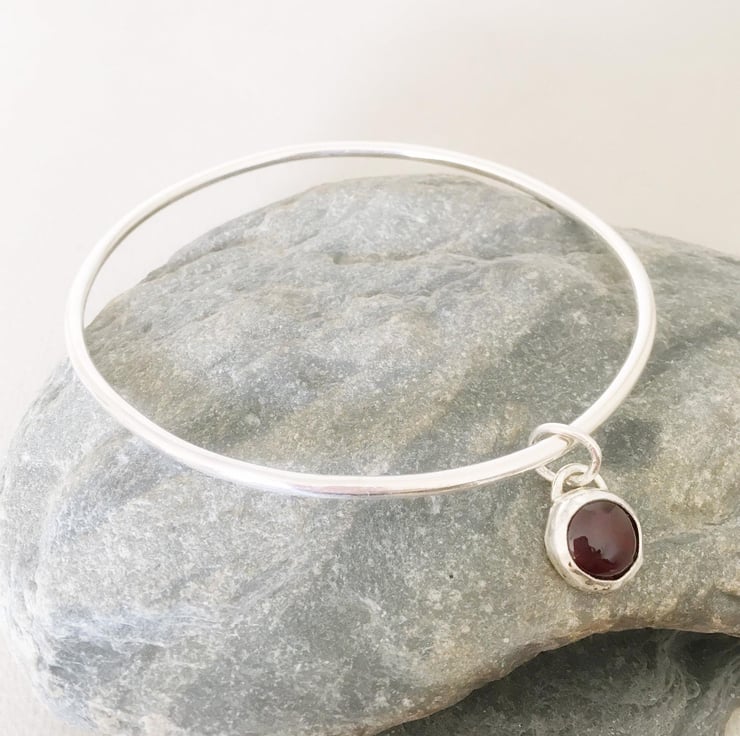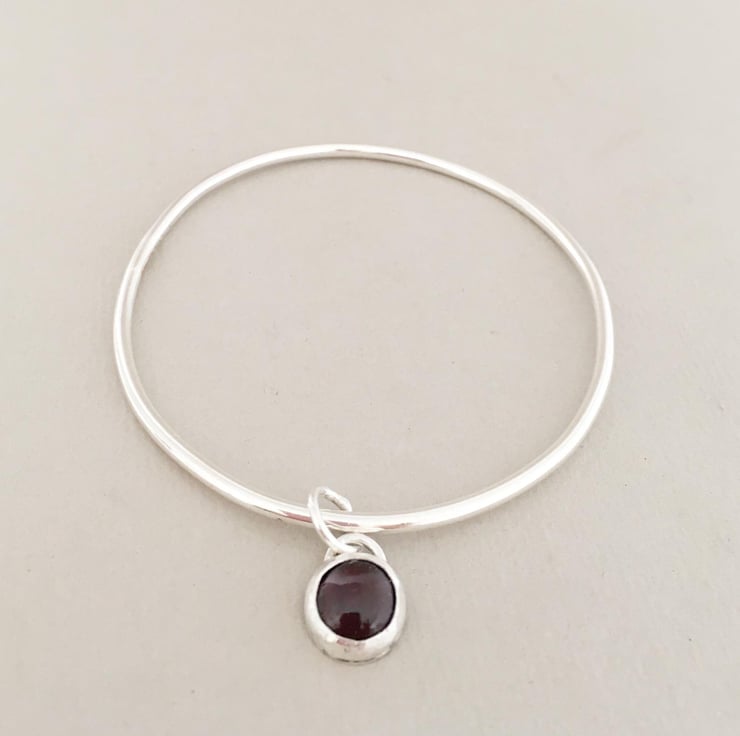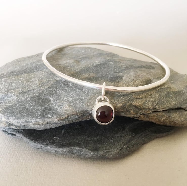 This listing is for a solid sterling silver bangle, made from thick silver wire. It has been cut, formed, soldered and polished by hand in my studio. I have attached a pretty 10mm garnet charm, also handmade.