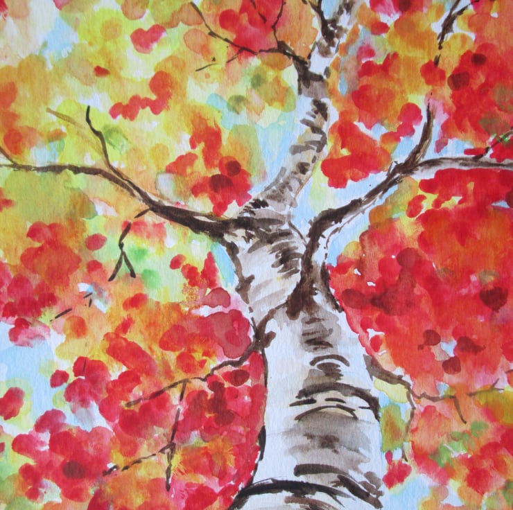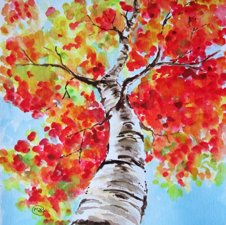 Autumn Tree. A colourful painting of a tall tree in brilliant autumn colours. A detailed watercolour of a tree with colourful leaves.