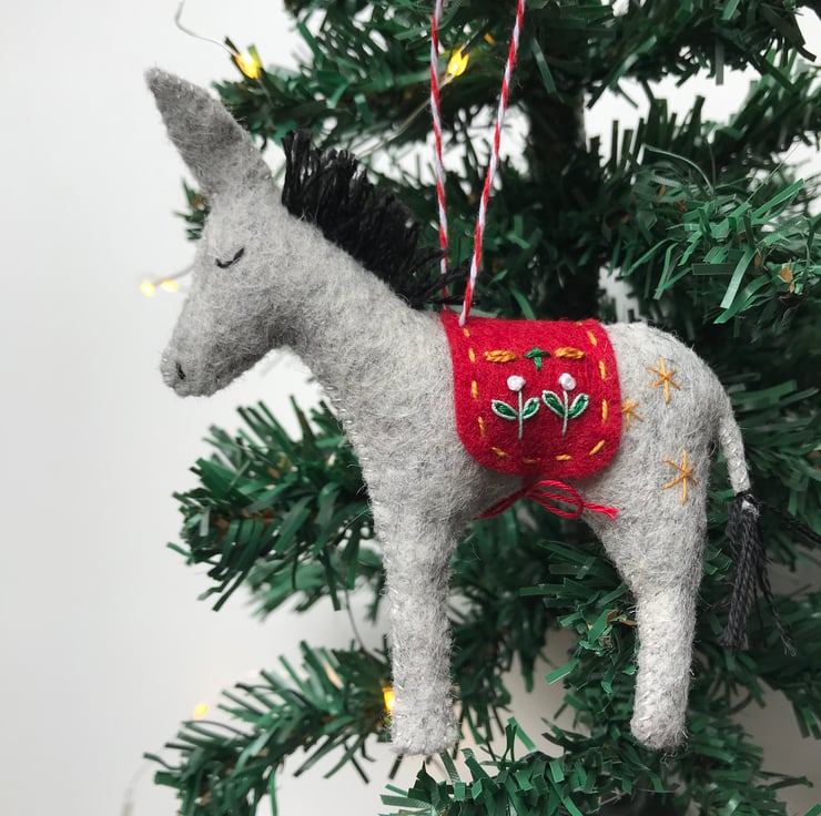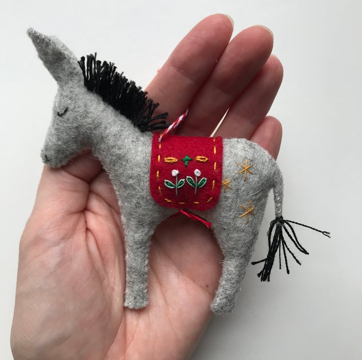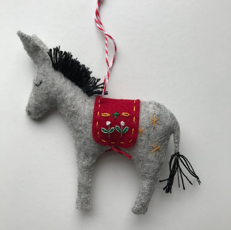 Made in soft 100% wool felt, the donkey is completely stitched by hand and finished with an embroidered blanket. The mane is hand stitched with perlé and wool thread. The donkey has tiny embroidered details, meaning no two are the same. This is a lovely decoration to be treasured for years to come.