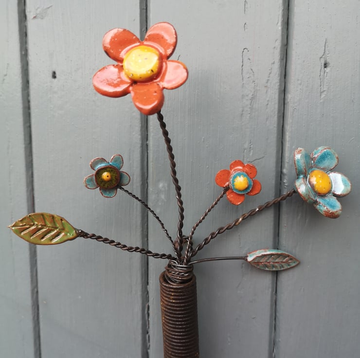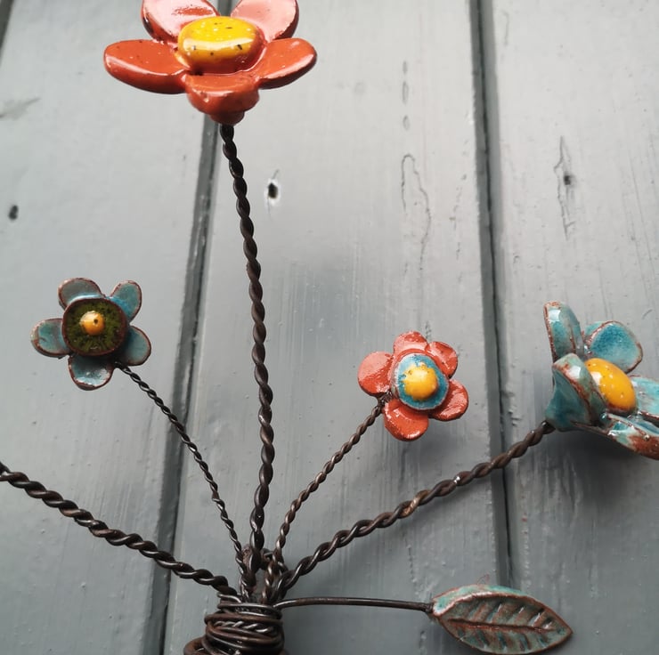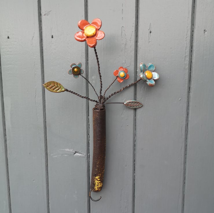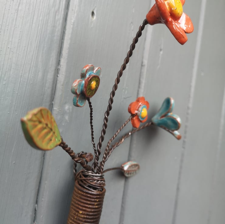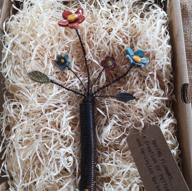 Pottery Flowers and foliage arranged in an upcycled spring! Each Flower and Leaf is handmade, and glazed before being attached to wire, and arranged in a reclaimed spring.