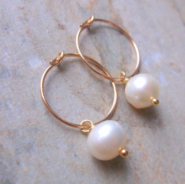 Gold filled 15 mm hoop earrings, with ivory freshwater pearls, grade A, size 8 mm. A stunning classic earring, suitable for all ages and all occasions. Free gift box tied with ribbon.