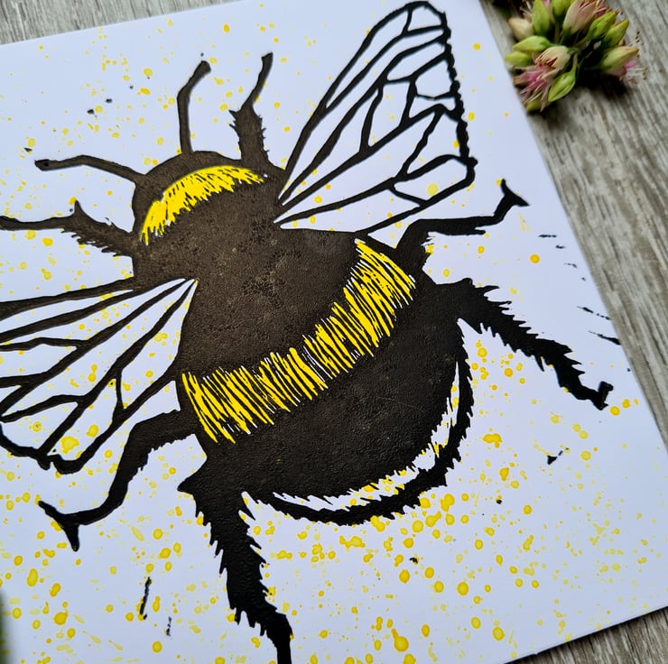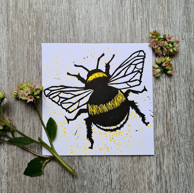 Bees are brilliant and this card is too! Speckled with vibrant yellow watercolour then individually, handprinted. Each card is a unique and special.